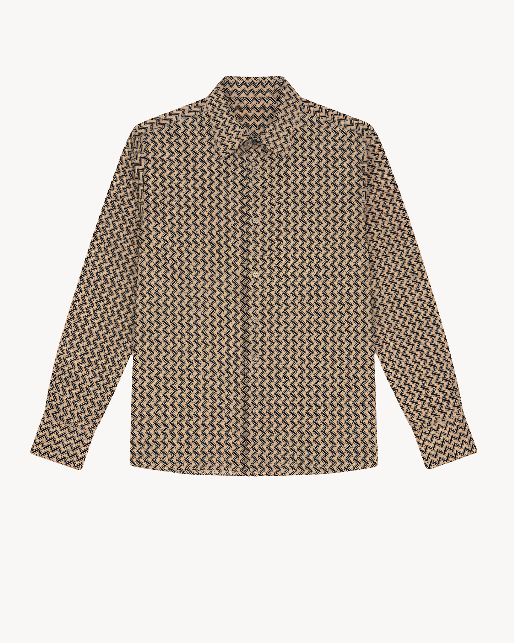 VINTAGE INSPIRED 70’S MOTIF SHIRT CRAFTED FROM 100% SILK CREPE DE CHINE FOR A SLEEK & CONTEMPORARY FEEL. FEATURING SIGNATURE POINT COLLAR & 2 BUTTON CUFFS WITH NATURAL MOTHER OF PEARL BUTTON TRIM.