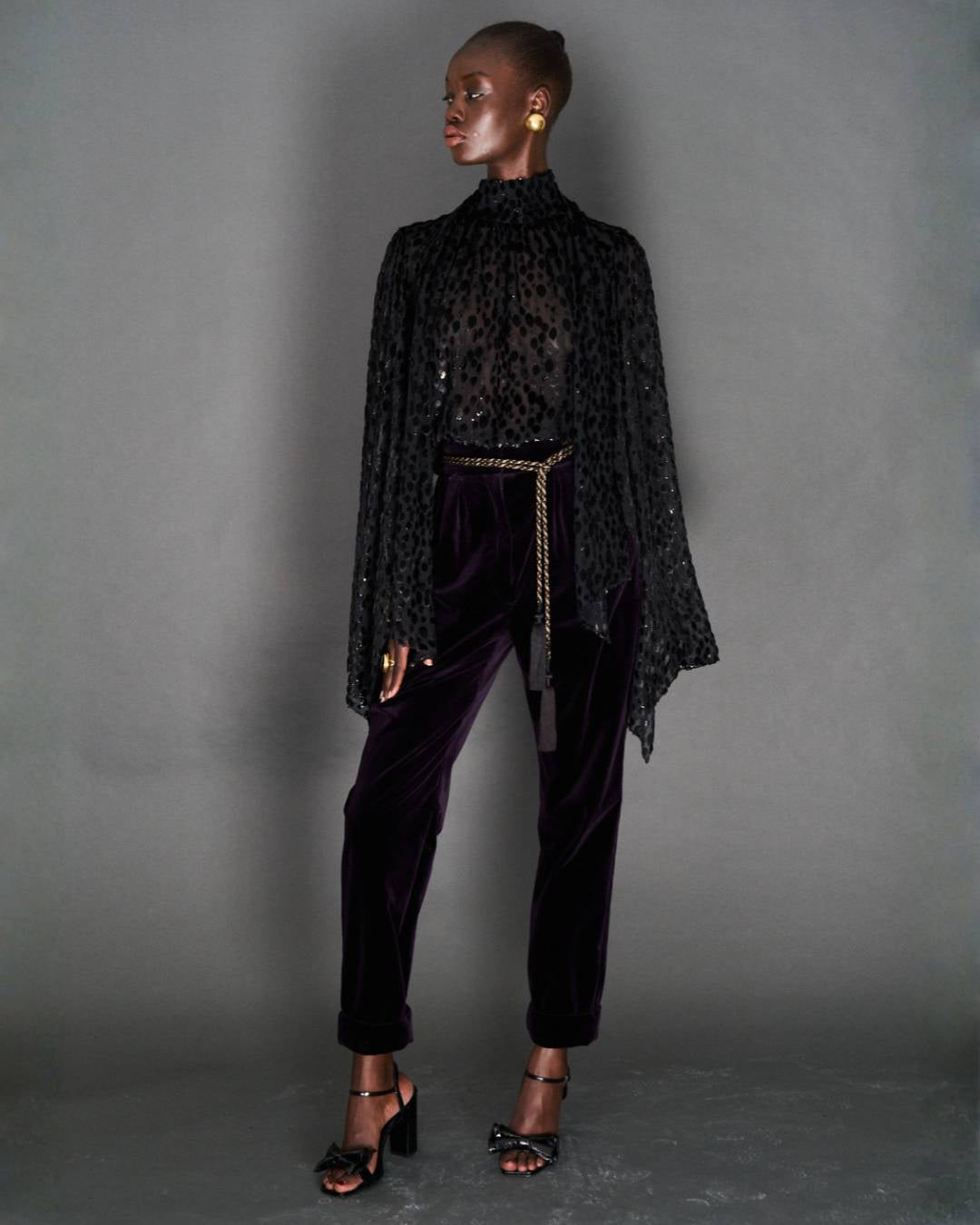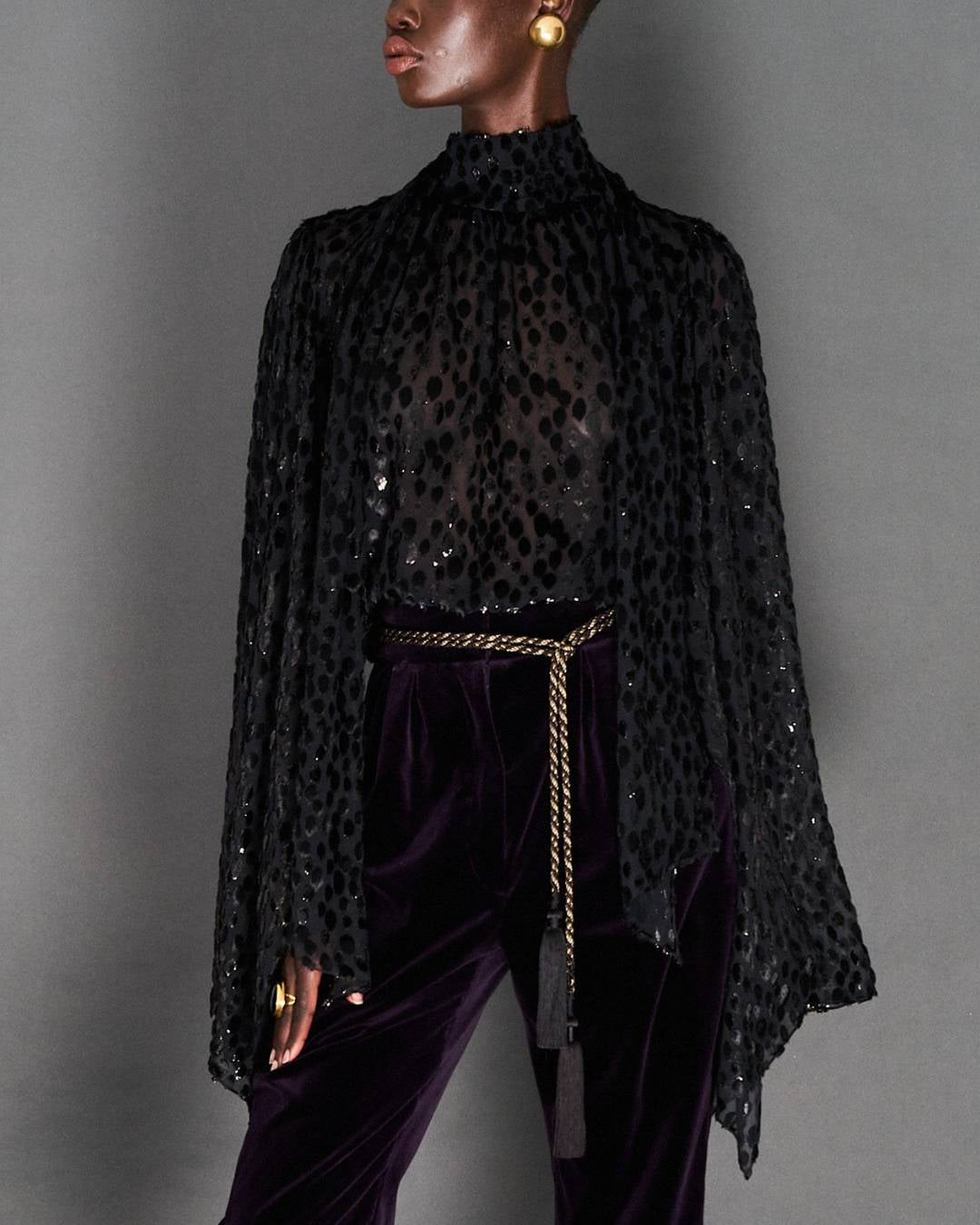 CREATE DRAMA WITH OUR ANGEL SLEEVE BLOUSE CUT FROM A SEMI-SHEER BLACK VELVET & LUREX SPOT BURNOUT.