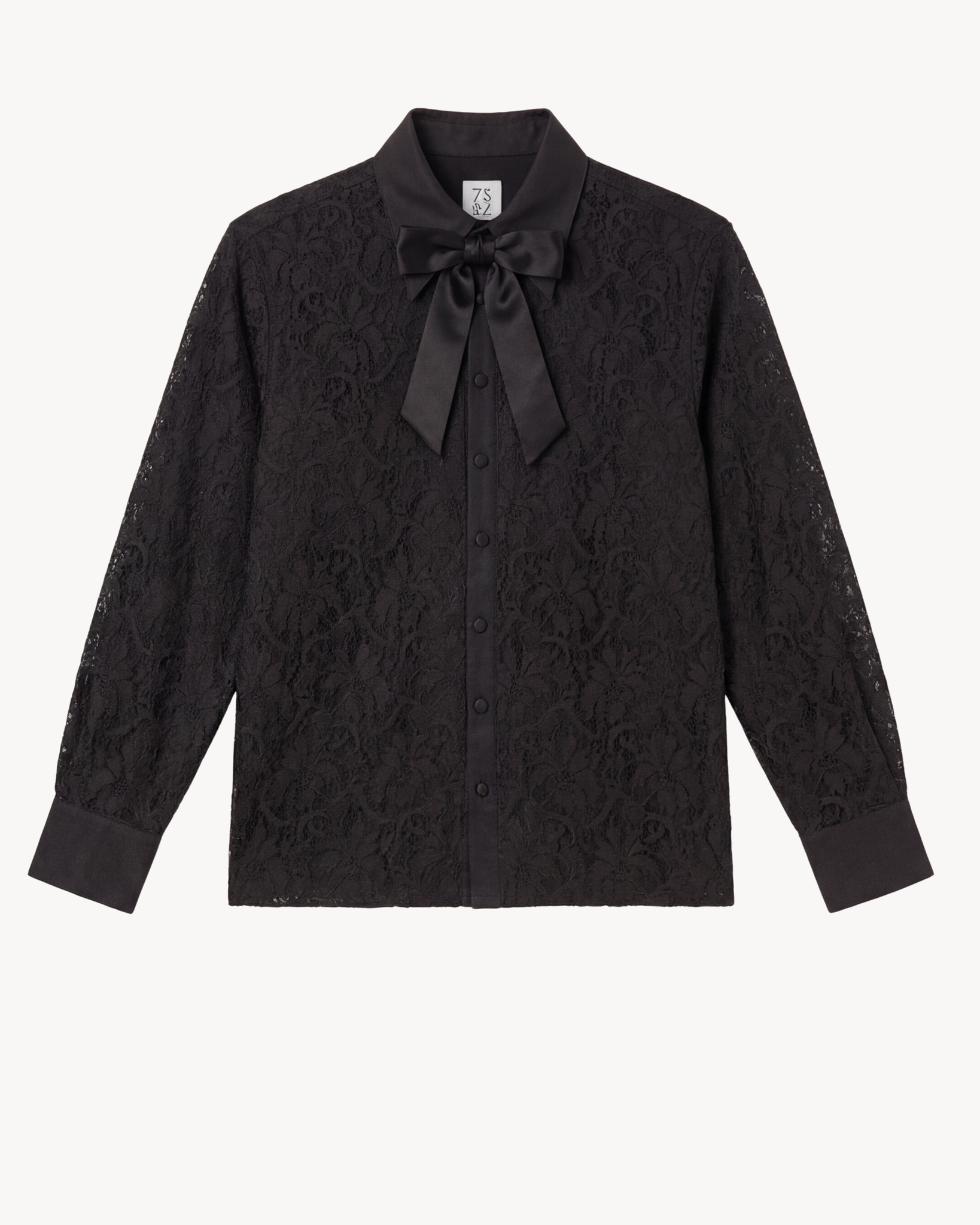 ELEVATE YOUR PARTY LOOK WITH 73 LONDON’S BLACK LACE SHIRT, FEATURING CHEST POCKETS AND COTTON SELF-TIE BOW AT NECK. LINED THROUGH THE BODY ONLY IN A LIGHTWEIGHT COTTON VOILE THIS STYLE OFFERS A LOUCHE ROMANTIC DAY TO EVENING LOOK.