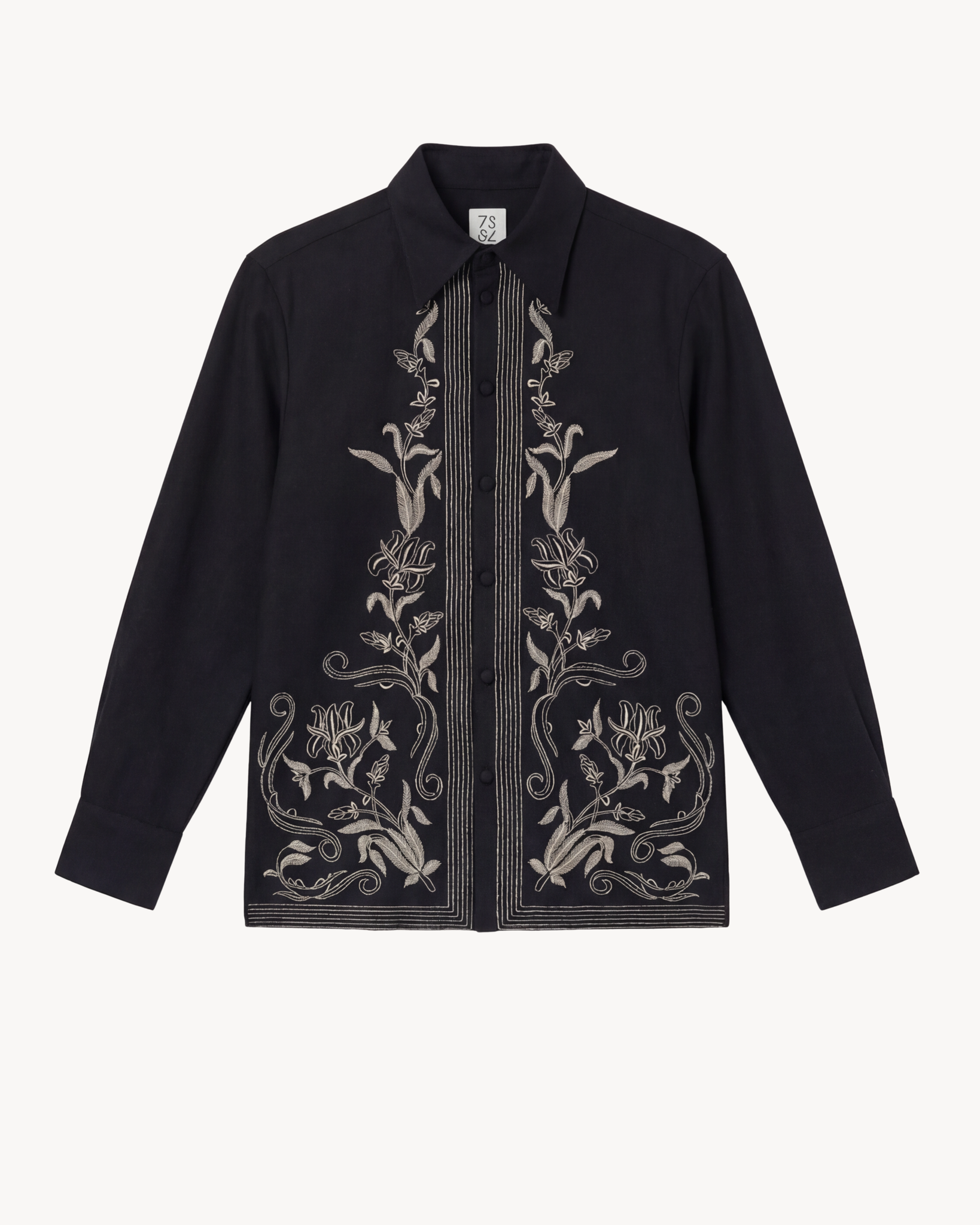 ARTISANAL BRUSHED COTTON SHIRT FEATURING STEM-FLORAL EMBROIDERY TO IMBUE ELEVATED DAY-TO-EVENING DRESSING. FEATURES 73LONDON’S SIGNATURE POINT COLLAR & TWO-BUTTONS CUFFS, FINISHED WITH MOTHER OF PEARL BUTTON TRIM.