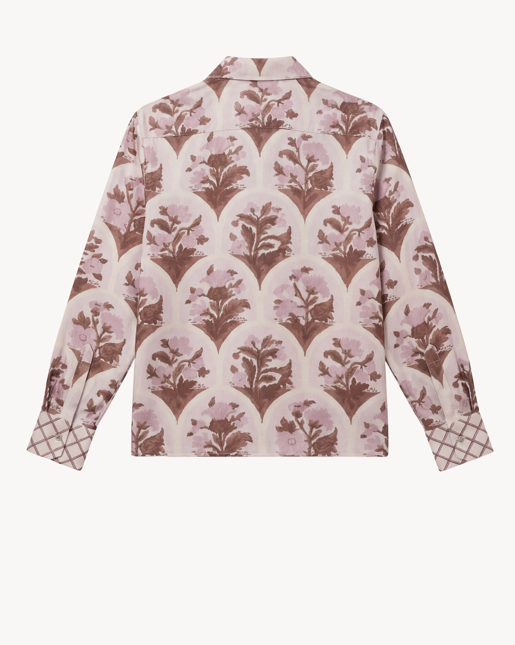 INSPIRED BY AN ANTIQUE WALLPAPER HAND-PAINTED IN THE EARLY 19TH CENTURY, OUR ARCHIVE TRELLIS FLORAL DESIGN IS CUT FROM 100% SILK CREPE, IN SHADES OF FADED SEPIA BROWN & LILAC.