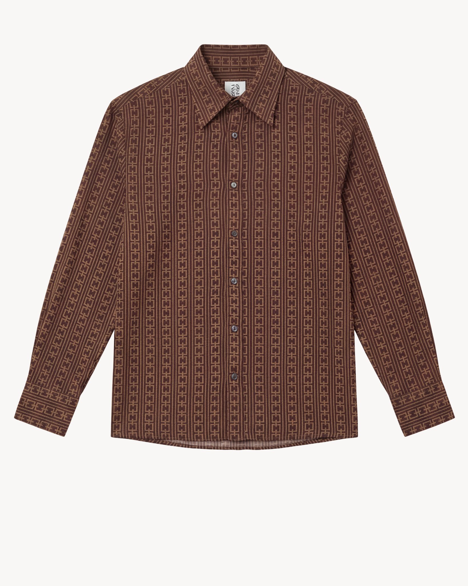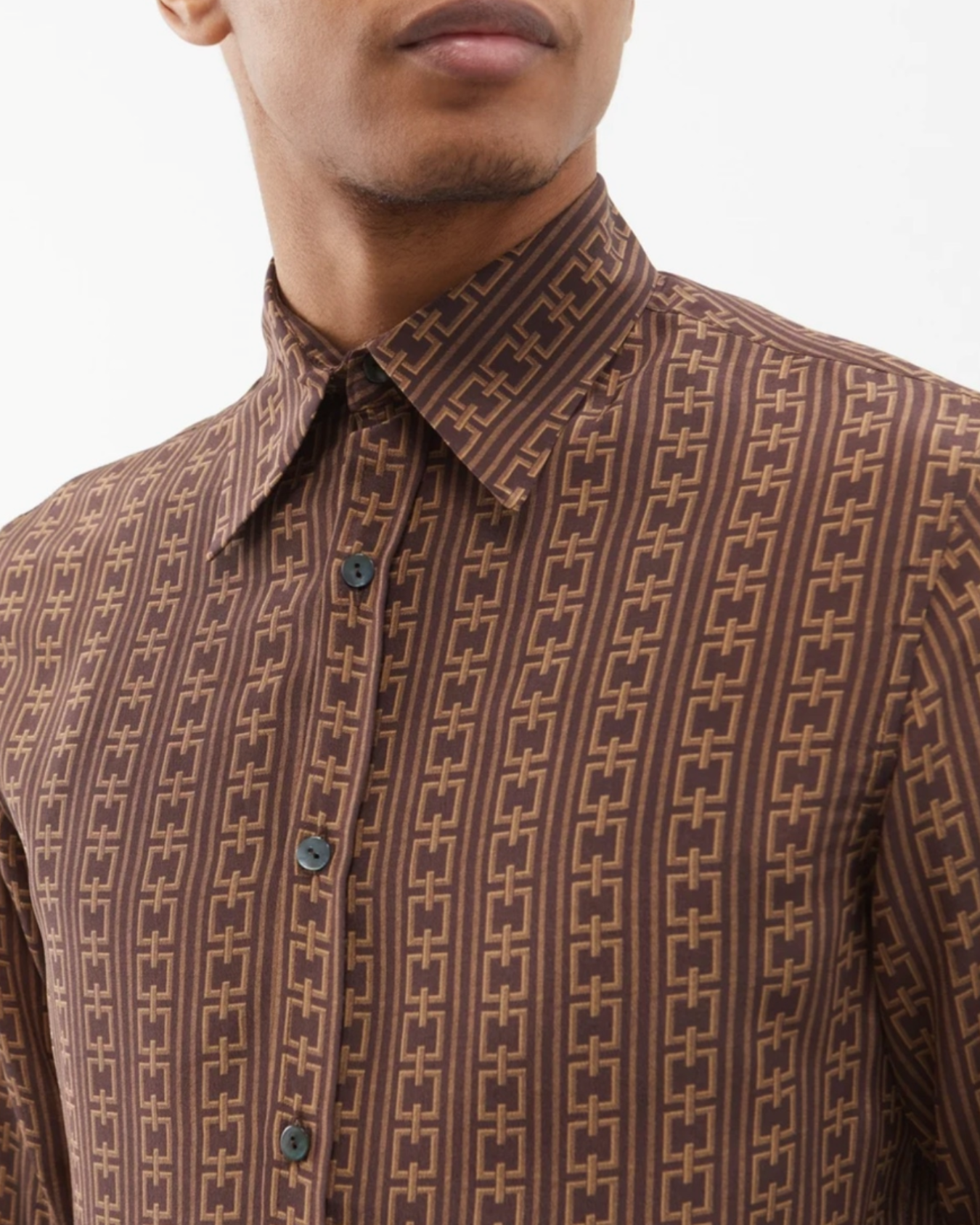 CHOCOLATE/CAMEL CHAIN PRINT NEO-CLASSICAL CHAIN PRINT IN CHOCOLATE & CAMEL HUES, INSPIRED BY ANCIENT ARCHITECTURE TO IMBUE LUXURY SILK SHIRTING. IDEAL FOR ELEVATED DAYTIME DRESSING AND PERFECT FOR GIFTING.
