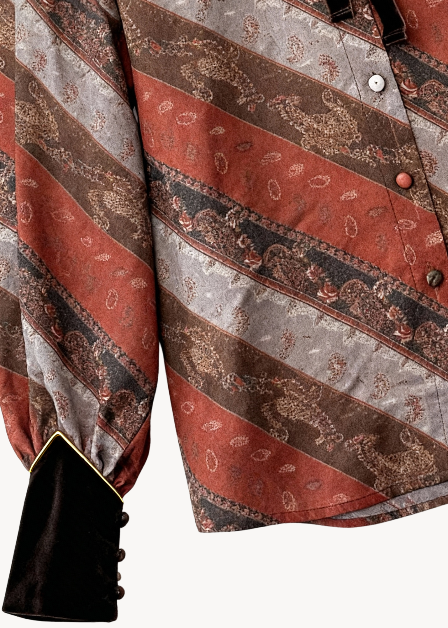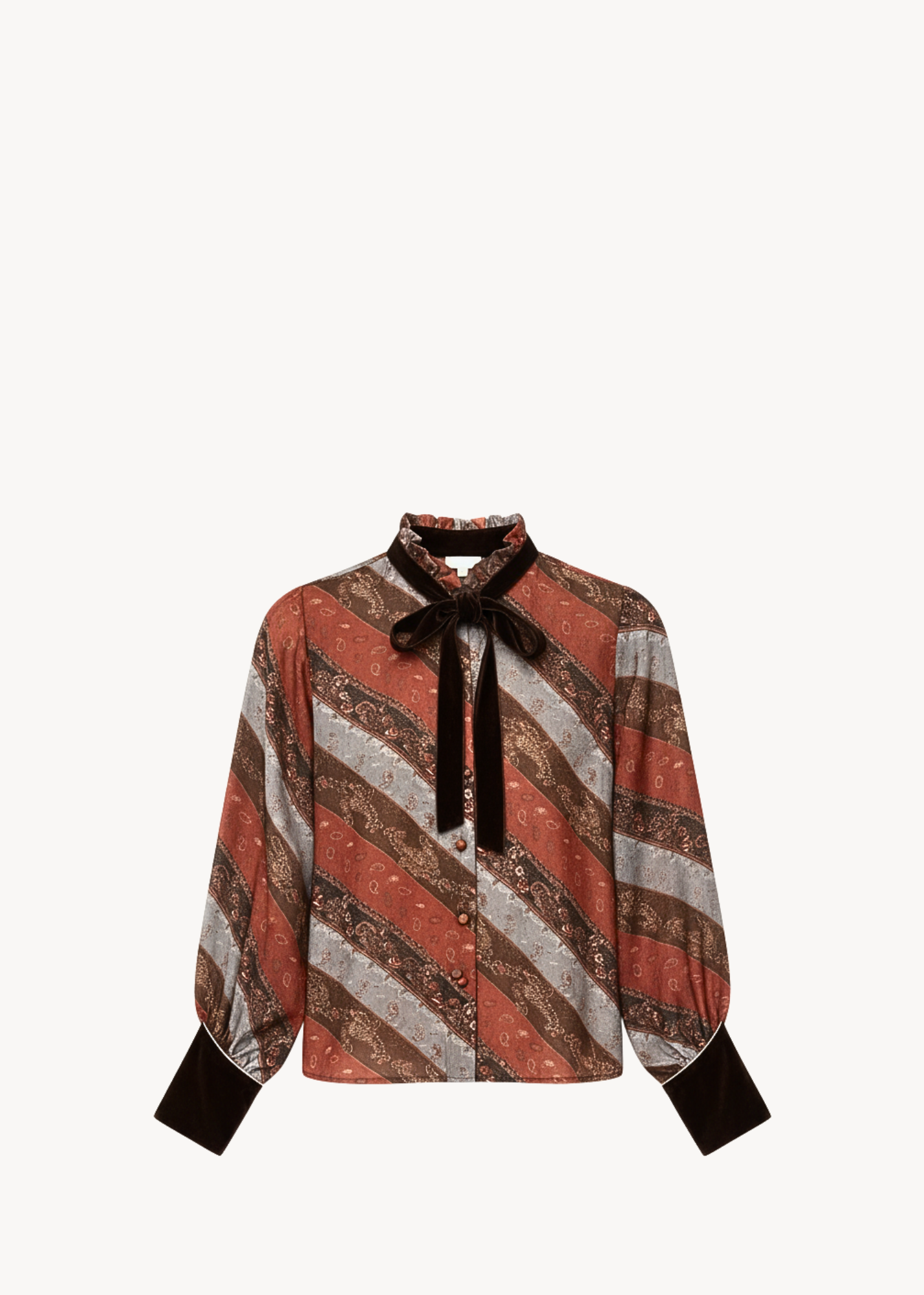DIAGONAL STRIPE BLOUSE WITH VELVET CUFFS & NECK TIE